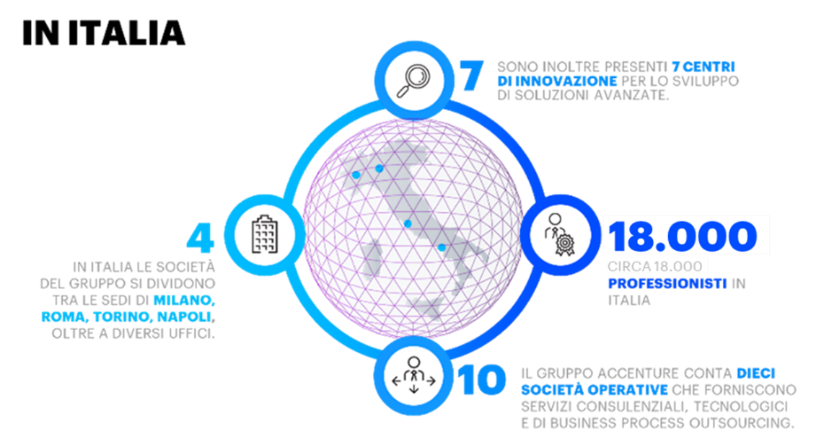 Accenture S.p.A. è parte del Gruppo internazionale Accenture (di cui fa parte anche Accenture Technology Solutions con cui ACN costituisce un unico centro decisionale), che offre servizi di consulenza direzionale, realizzazione di sistemi e consulenza tecnologica e servizi alla PA e alle imprese. Il gruppo impiega nel mondo 738.000 professionisti che collaborano con oltre 6.000 clienti in più di 120 paesi. In Italia, Accenture conta oltre 20.000 dipendenti nelle sedi di Milano, Roma, Torino, Napoli, Cagliari oltre a diversi altri uffici sul territorio nazionale, che hanno sviluppato, nell’esercizio 2022, un fatturato di oltre 2,625 miliardi di euro lavorando per oltre 300 clienti. Il nuovo sistema organizzativo è basato sulle competenze come fattore chiave del successo attraverso un mindset collaborativo, basato sul networking delle aree di servizio Strategy & Consulting, Song, Technology e Operations.