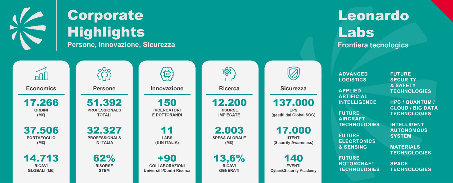 RICERCA E INNOVAZIONE. Con circa il 13,6 % dei ricavi del 2022, Leonardo è una delle maggiori aziende che investono a livello mondiale in ricerca e sviluppo nel settore dell’Aerospazio, Difesa e Sicurezza. I processi aziendali di innovazione sono supportati da 11 LABS a livello internazionale, di cui 6 in Italia. Leonardo è Sustainability Leader nei Dow Jones Sustainability Indices di S&P Global da 13 anni, con il punteggio più alto del settore Aerospazio & Difesa per il quarto anno consecutivo.