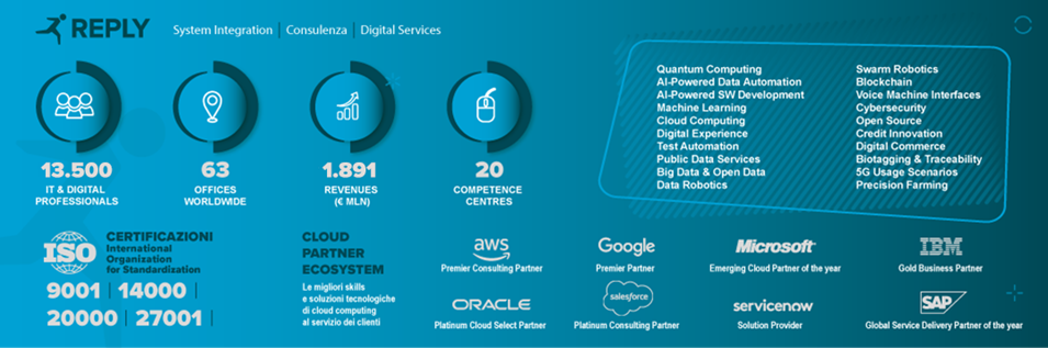 Il gruppo Reply è specializzato in servizi di consulenza e di integrazione dei sistemi per tutti i mercati (Healthcare, Government e Defence, Telco e Media, Manufacturing e Retail, Energy e Utilities, Finance). Reply è costituita da un modello a rete di aziende altamente specializzate, che affiancano i principali gruppi industriali ed enti pubblici nella definizione e nello sviluppo di modelli di business e di servizio abilitati dai nuovi paradigmi tecnologici e di comunicazione, quali l’Intelligenza Artificiale, Big Data, Cloud Computing, Digital Communication, Internet degli Oggetti, Mobile e Social Networking, per ottimizzare e integrare processi, applicazioni e dispositivi. Nel Public Sector Reply supporta le amministrazioni nel percorso di transizione digitale attraverso competenze su tutte le tecnologie emergenti, orchestrando e integrando applicazioni e architetture, offrendo soluzioni innovative a livello centrale, locale e sanitario, realizzando portali, sistemi gestionali, documentali, di dematerializzazione e conservazione, sistemi di monitoraggio e controllo, soluzioni per l’analisi dei dati presso tutte le principali realtà centrali tra cui: Agenzia delle Entrate, Ministero dei Beni Culturali, Ministero dell’Ambiente, Ministero Affari Esteri, Ministero dell’Interno, Arma dei Carabinieri, AgID, Ministero della Salute, Ministero dello Sviluppo Economico, INPS, INAIL, Cassa Depositi e Prestiti, Presidenza del Consiglio dei Ministri, Ministero dell’Economia e delle Finanze attraverso Sogei, Regione Veneto, Azienda Zero, Aria.